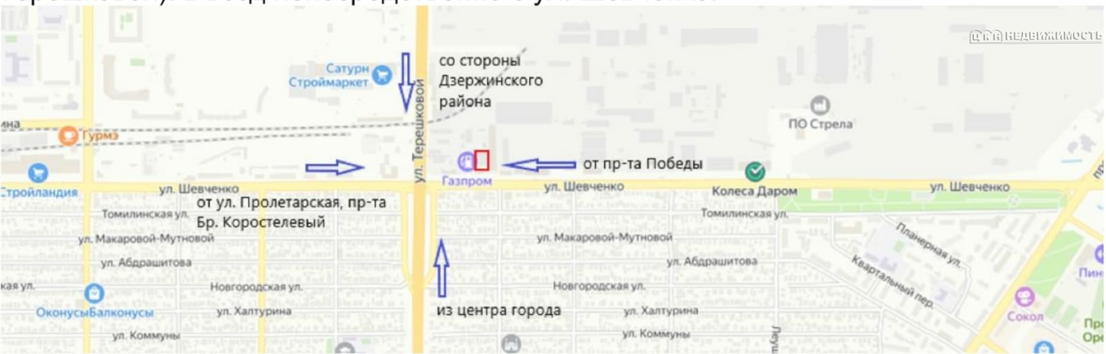Объект расположен на первой линии по ул. Шевченко (120 метров от моста ул.Терешковой). Въезд непосредственно с ул. Шевченко. Удобные подъездные пути со всех основных городских улиц (Терешковой, Победы,