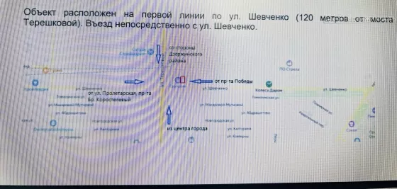 Объект расположен на первой линии по ул. Шевченко (120 метров от моста ул.Терешковой). Въезд непосредственно с ул. Шевченко. Удобные подъездные пути со всех основных городских улиц (Терешковой, Победы,