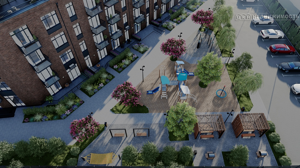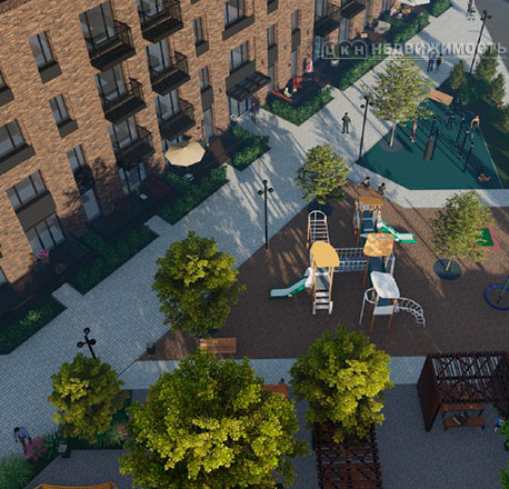 Во дворе дома предусмотрены прогулочная и зона отдыха с мангалами и беседками, современная детская площадка, надземный паркинг.